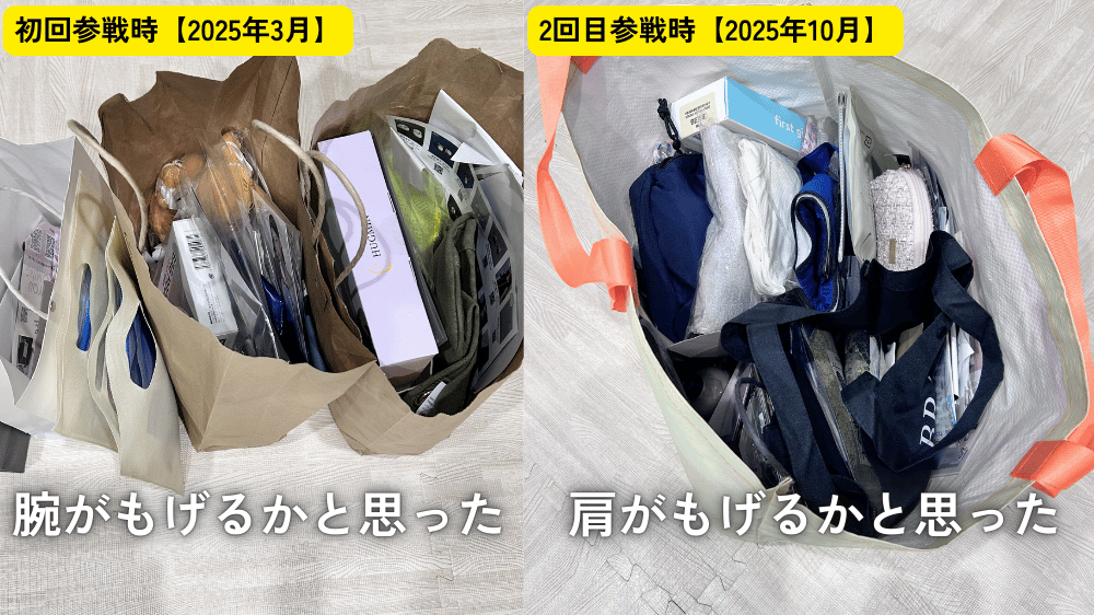 以上を踏まえて次回は空のキャリーケースを持って参戦します!!
